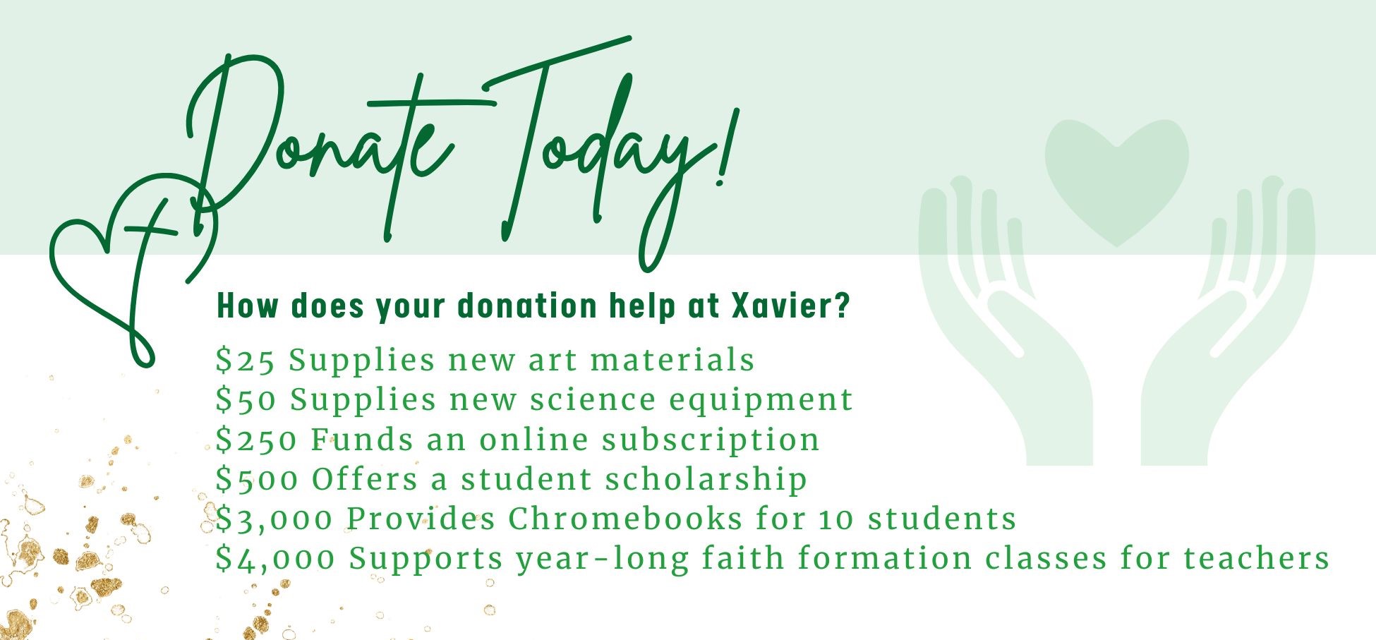 Ignite the Green and White is our largest fundraiser of the year. Do you know the cost to educate a student at Xavier Catholic School is over $8,000? However, no family is asked to pay that amount. Between the subsidies of the area parishes and our school fundraisers, we are able to keep our tuition cost for families much lower. Why do we do this? Catholic education is essential to the moral, social, and academic well-being of children and the future of our community. Your support in this major fundraiser helps us maintain a balanced budget, hire well-qualified teachers, and pass along the Catholic faith as we work to form disciples of Christ.